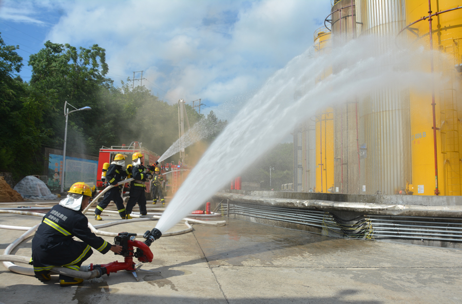 根據(jù)應(yīng)急預(yù)案響應(yīng),參演人員全力以赴,積極應(yīng)對險情;公司消防隊迅速出動,專職消防人員從架設(shè)水槍開展專業(yè)撲救,到身穿防化服進(jìn)入泄漏點進(jìn)行檢測和堵漏;環(huán)保人員對事故現(xiàn)場周圍大氣環(huán)境和事故污水進(jìn)行了收集和有效監(jiān)測,充分展示了有機分廠、保衛(wèi)處消防隊、生產(chǎn)安環(huán)部等相關(guān)單位的應(yīng)急處置能力,達(dá)到了練指揮、練技能、練協(xié)同、練戰(zhàn)法、練保障的效果。