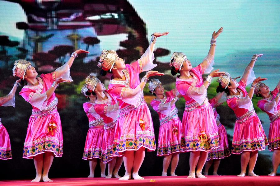 廣西皖維公司的職工們帶來了舞蹈《壯鄉(xiāng)情韻》。與內(nèi)蒙豪邁粗獷不同的是,廣維職工的表演細(xì)膩、深沉,帶有濃濃的壯鄉(xiāng)風(fēng)情,把現(xiàn)場職工帶進(jìn)了劉三姐的故鄉(xiāng)。表演結(jié)束后,廣維的姐妹還以傳統(tǒng)的拋繡球方式,進(jìn)步把現(xiàn)場氣氛推向高潮。