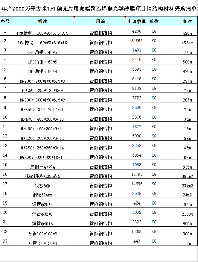 2、項目名稱:年產(chǎn)2000萬平方米TFT偏光片用寬幅聚乙烯醇光學薄膜項目鋼結構材料采購